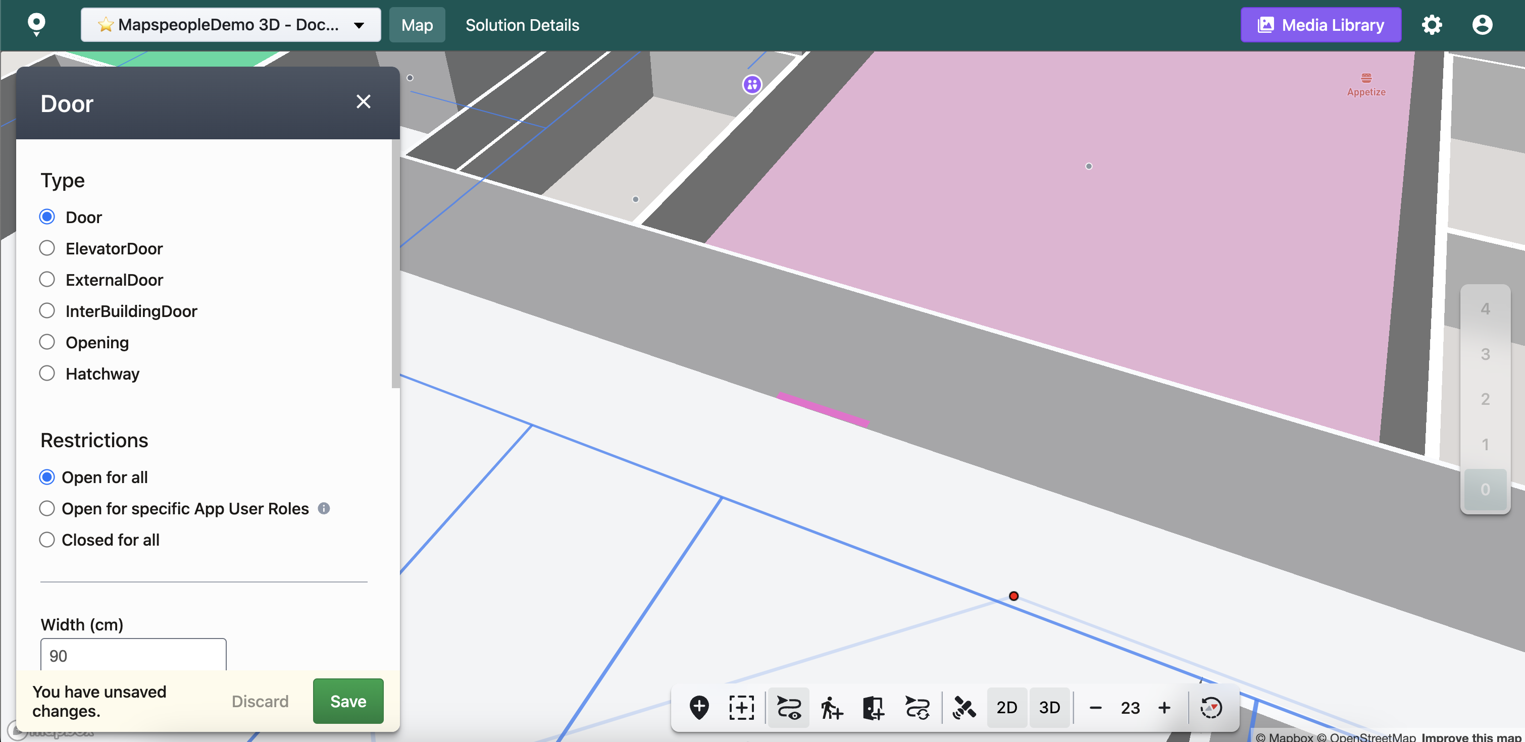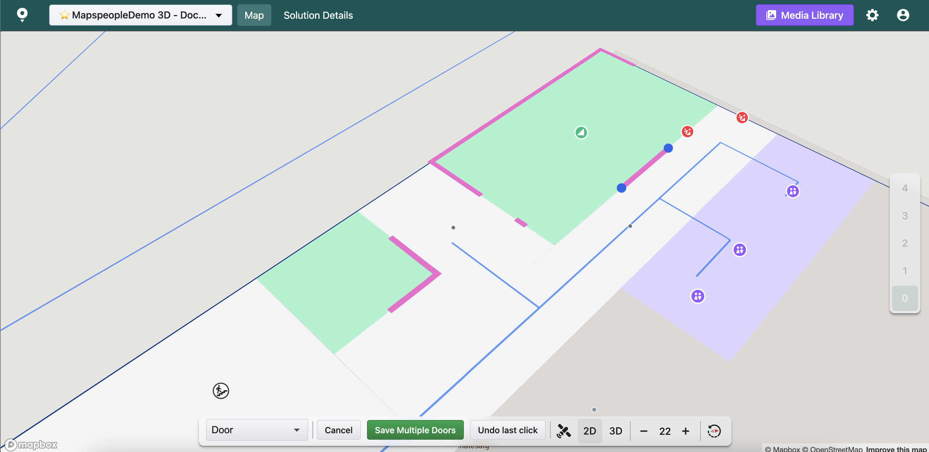 Doors are Route Elements that allow you to manipulate certain portions of the Route Network and indicate the presence of a door - or other entryway - in a building. A Door is a connection between two Rooms, or from outside a Building and into it. A new door can be created only for solutions with [Automatic Graph Setup](https://docs.mapsindoors.com/products/cms/route-network).