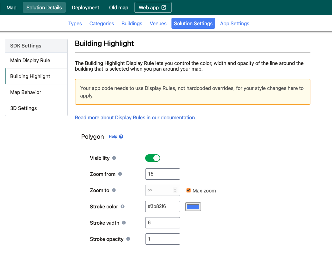 In the CMS, you can edit the Building Outline Display Rules by navigating from `Solution Details` -> `Solution Settings` -> `Building Highlight`. Here you will find the "Polygon" section that contains options related to the appearance of the Building Outline. You see your setting by navigating to `Map`.