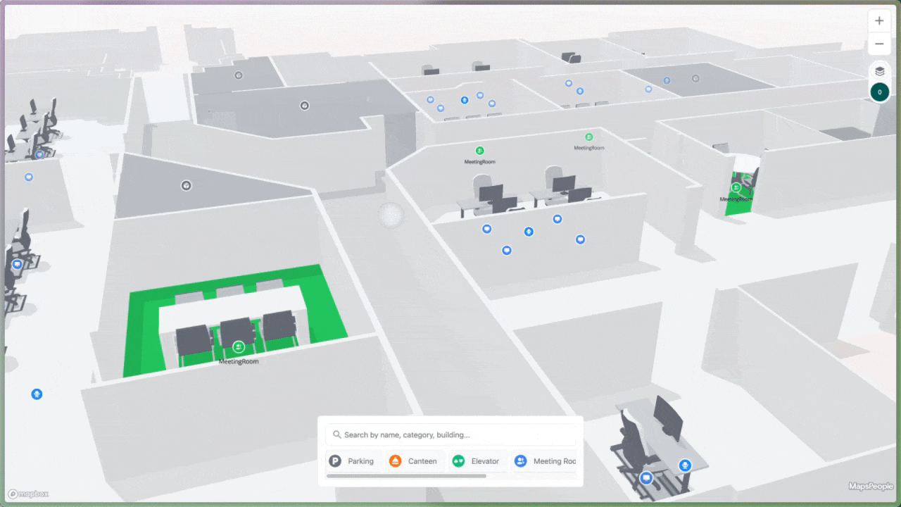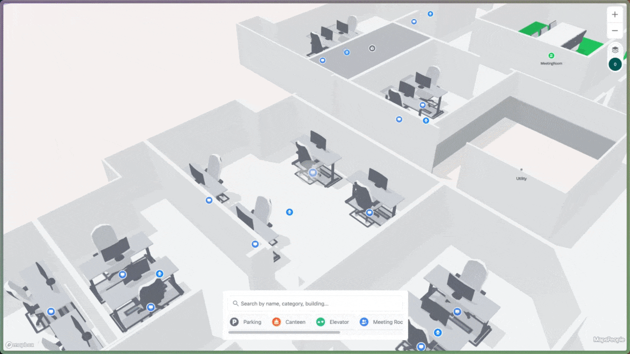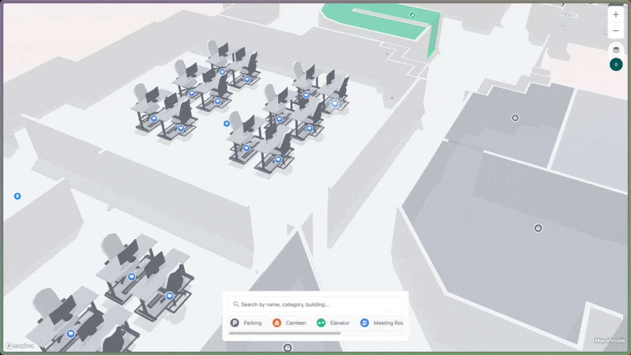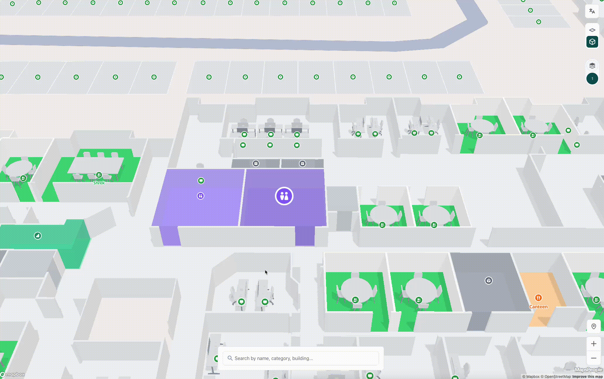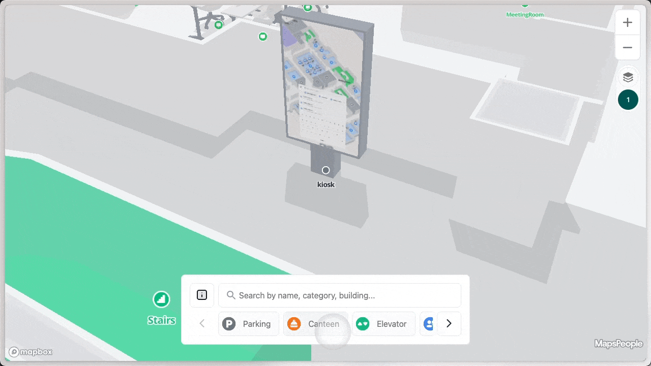 You can find an example [here](https://map.mapsindoors.com/?apiKey=02c329e6777d431a88480a09\&kioskOriginLocationId=b47a973a8450439598c0189c\&useKeyboard=true\&pitch=50\&bearing=180\&timeout=10), of our own-pre-built web app with the Kiosk mode, pitch and bearing set to set the angle of our virtual Kiosk on the map.
