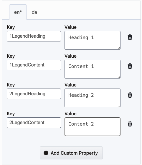 In order to add content on the legend info you need to use pre-defined custom properties: `1LegendHeading, 1LegendContent, 2LegendHeading, 2LegendContent etc` as keys and add a value that you want to be displayed in the legend. (i.e. title, phone number, opening hours, information about the kiosk etc)