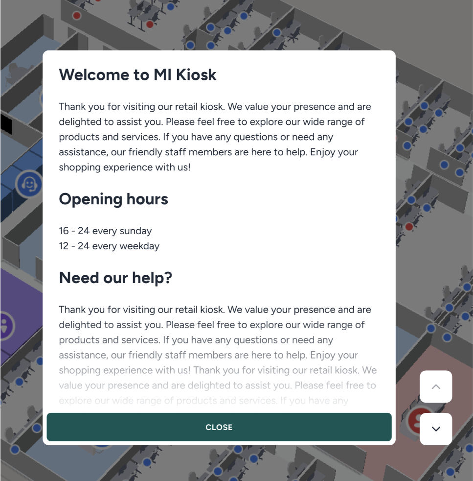 In the Kiosk you can add an information modal which is a modal that can contain any preferred content you would like to show on the location.