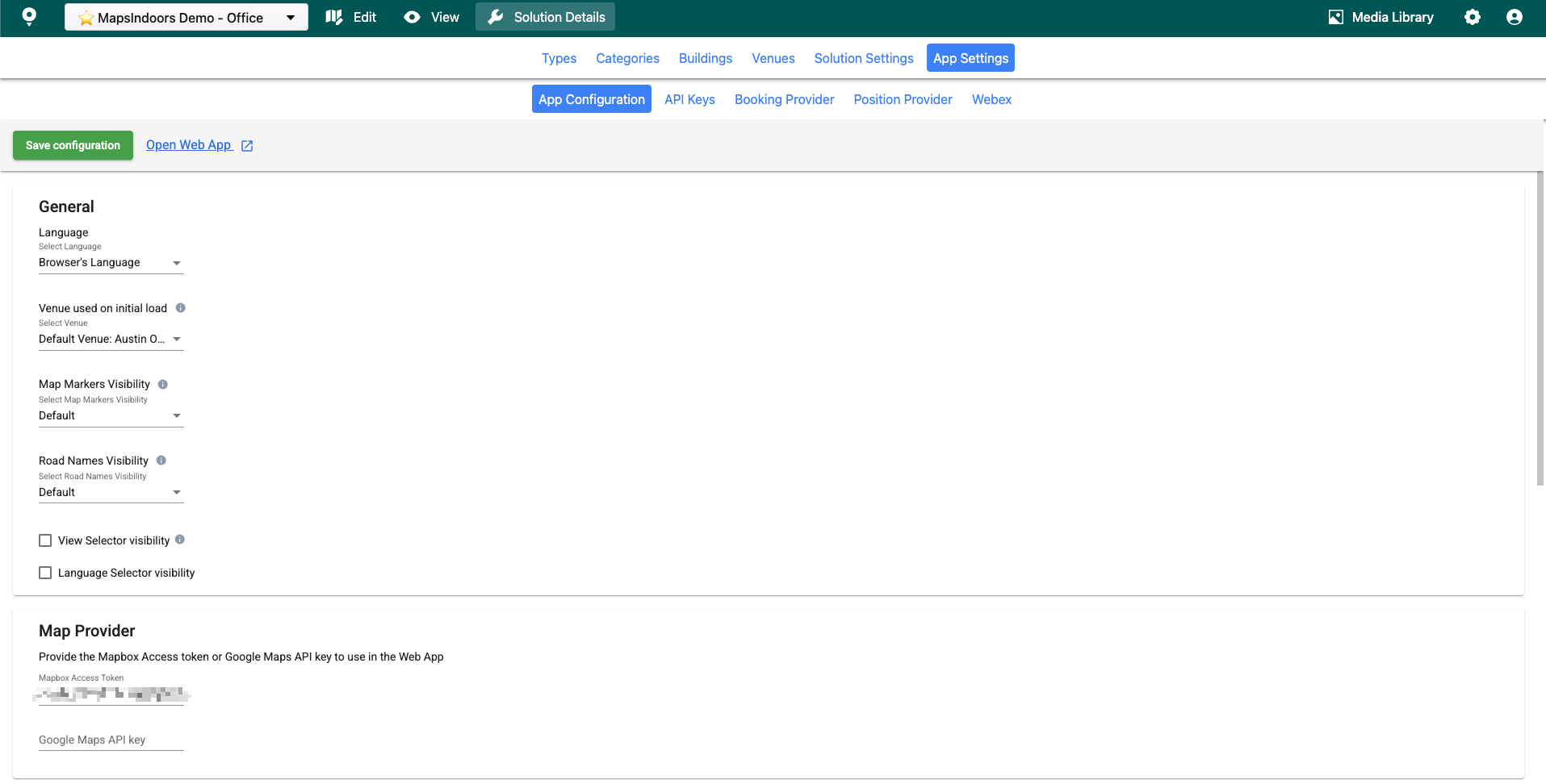 To configure your MapsIndoors Web App, navigate to navigate to :wrench: **Solution Details** → **App Settings** → [**App Configuration**,](https://cms.mapsindoors.com/app-settings/app-config) under the solution you want to deploy. Here, you can configure how your web app behaves regarding language, styling, load view, categories, and more.
